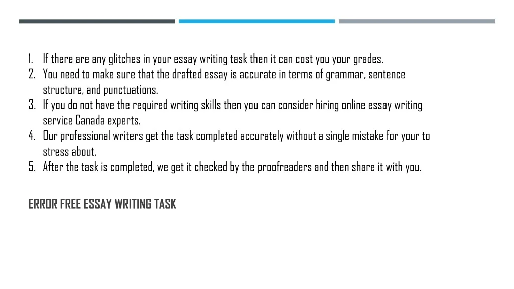 If there are any glitches in your essay writing task then it can cost you your grades. You need to make sure that the drafted essay is accurate in terms of grammar, sentence structure, and punctuations. If you do not have the required writing skills then you can consider hiring online essay writing service Canada experts. Our professional writers get the task completed accurately without a single mistake for your to stress about. After the task is completed, we get it checked by the proofreaders and then share it with you. Error Free Essay Writing Task