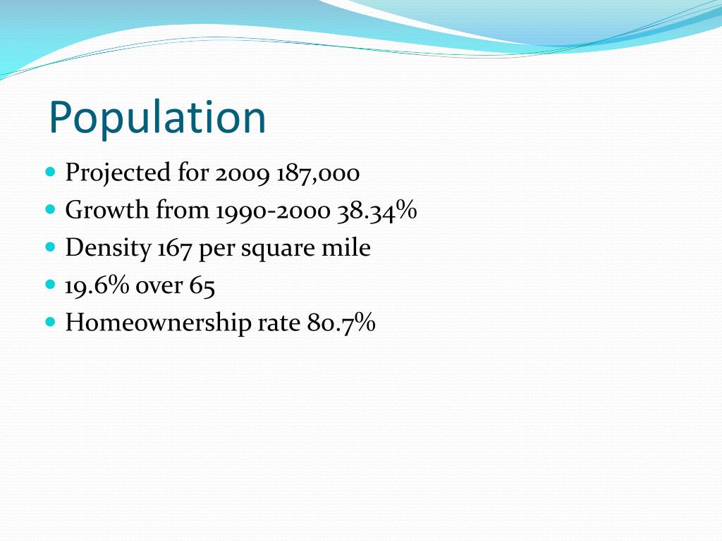 Population • Projected for 2009 187,000 • Growth from 1990-2000 38.34% • Density 167 per square mile • 19.6% over 65 • Homeownership rate 80.7%
