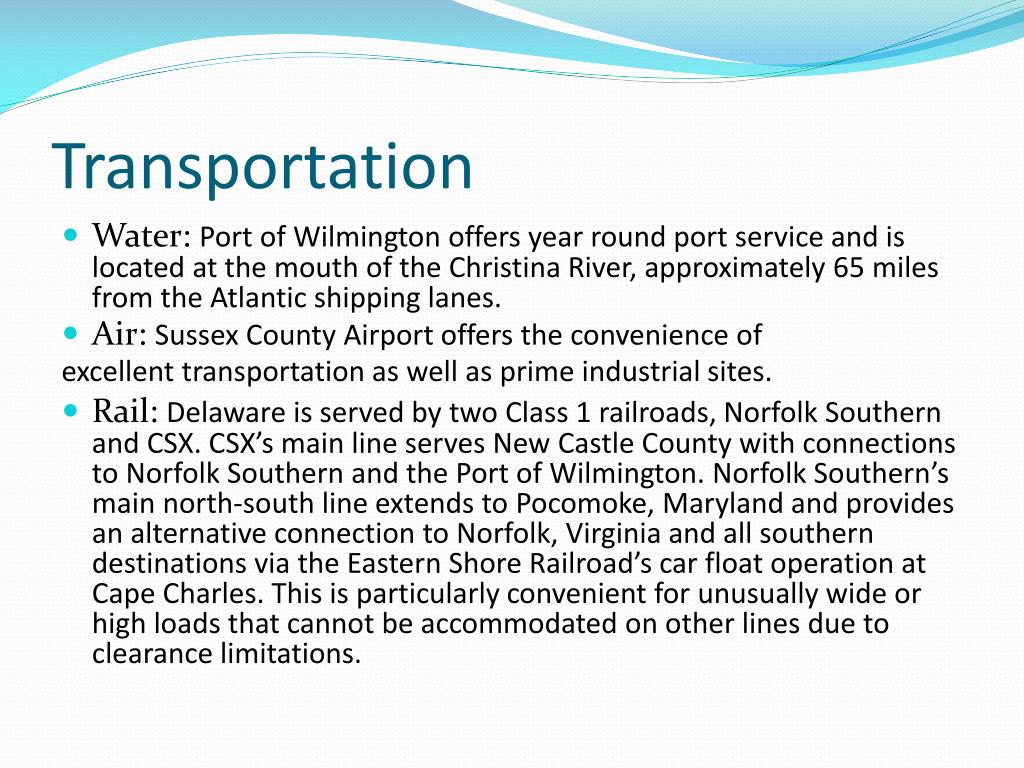 Transportation • Water: Port of Wilmington offers year round port service and is located at the mouth of the Christina River, approximately 65 miles from the Atlantic shipping lanes. • Air: Sussex County Airport offers the convenience of excellent transportation as well as prime industrial sites. • Rail: Delaware is served by two Class 1 railroads, Norfolk Southern and CSX. CSX’s main line serves New Castle County with connections to Norfolk Southern and the Port of Wilmington. Norfolk Southern’s main north‐south line extends to Pocomoke, Maryland and provides an alternative connection to Norfolk, Virginia and all southern destinations via the Eastern Shore Railroad’s car float operation at Cape Charles. This is particularly convenient for unusually wide or high loads that cannot be accommodated on other lines due to clearance limitations.
