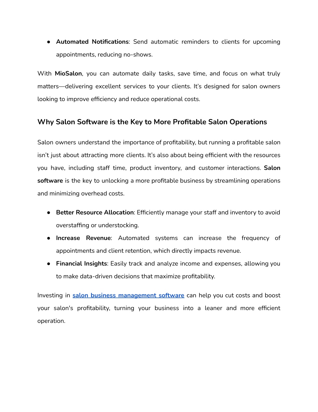 ● Automated Notifications: Send automatic reminders to clients for upcoming appointments, reducing no-shows. With MioSalon, you can automate daily tasks, save time, and focus on what truly matters—delivering excellent services to your clients. It’s designed for salon owners looking to improve efficiency and reduce operational costs. Why Salon Software is the Key to More Profitable Salon Operations Salon owners understand the importance of profitability, but running a profitable salon isn’t just about attracting more clients. It’s also about being efficient with the resources you have, including staff time, product inventory, and customer interactions. Salon software is the key to unlocking a more profitable business by streamlining operations and minimizing overhead costs. ● Better Resource Allocation: Efficiently manage your staff and inventory to avoid overstaffing or understocking. ● Increase Revenue: Automated systems can increase the frequency of appointments and client retention, which directly impacts revenue. ● Financial Insights: Easily track and analyze income and expenses, allowing you to make data-driven decisions that maximize profitability. Investing in salon business management software can help you cut costs and boost your salon's profitability, turning your business into a leaner and more efficient operation.