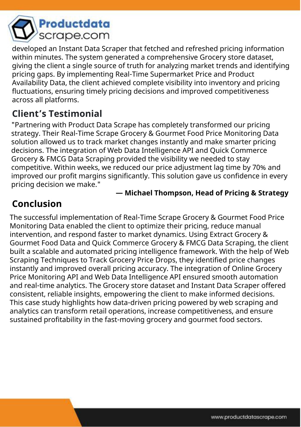 developed an Instant Data Scraper that fetched and refreshed pricing information within minutes. The system generated a comprehensive Grocery store dataset, giving the client a single source of truth for analyzing market trends and identifying pricing gaps. By implementing Real-Time Supermarket Price and Product Availability Data, the client achieved complete visibility into inventory and pricing fluctuations, ensuring timely pricing decisions and improved competitiveness across all platforms. Client’s Testimonial "Partnering with Product Data Scrape has completely transformed our pricing strategy. Their Real-Time Scrape Grocery & Gourmet Food Price Monitoring Data solution allowed us to track market changes instantly and make smarter pricing decisions. The integration of Web Data Intelligence API and Quick Commerce Grocery & FMCG Data Scraping provided the visibility we needed to stay competitive. Within weeks, we reduced our price adjustment lag time by 70% and improved our profit margins significantly. This solution gave us confidence in every pricing decision we make." — Michael Thompson, Head of Pricing & Strategy Conclusion The successful implementation of Real-Time Scrape Grocery & Gourmet Food Price Monitoring Data enabled the client to optimize their pricing, reduce manual intervention, and respond faster to market dynamics. Using Extract Grocery & Gourmet Food Data and Quick Commerce Grocery & FMCG Data Scraping, the client built a scalable and automated pricing intelligence framework. With the help of Web Scraping Techniques to Track Grocery Price Drops, they identified price changes instantly and improved overall pricing accuracy. The integration of Online Grocery Price Monitoring API and Web Data Intelligence API ensured smooth automation and real-time analytics. The Grocery store dataset and Instant Data Scraper offered consistent, reliable insights, empowering the client to make informed decisions. This case study highlights how data-driven pricing powered by web scraping and analytics can transform retail operations, increase competitiveness, and ensure sustained profitability in the fast-moving grocery and gourmet food sectors.