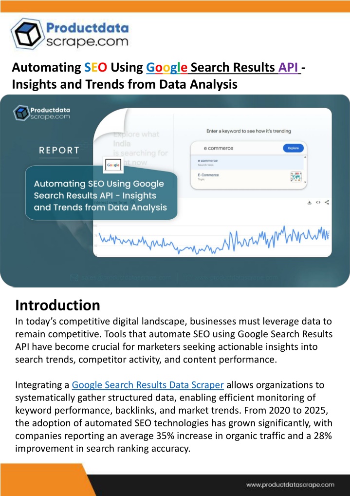 Automating SEO Using Google Search Results API - Insights and Trends from Data Analysis Introduction In today’s competitive digital landscape, businesses must leverage data to remain competitive. Tools that automate SEO using Google Search Results API have become crucial for marketers seeking actionable insights into search trends, competitor activity, and content performance. Integrating a Google Search Results Data Scraper allows organizations to systematically gather structured data, enabling efficient monitoring of keyword performance, backlinks, and market trends. From 2020 to 2025, the adoption of automated SEO technologies has grown significantly, with companies reporting an average 35% increase in organic traffic and a 28% improvement in search ranking accuracy.