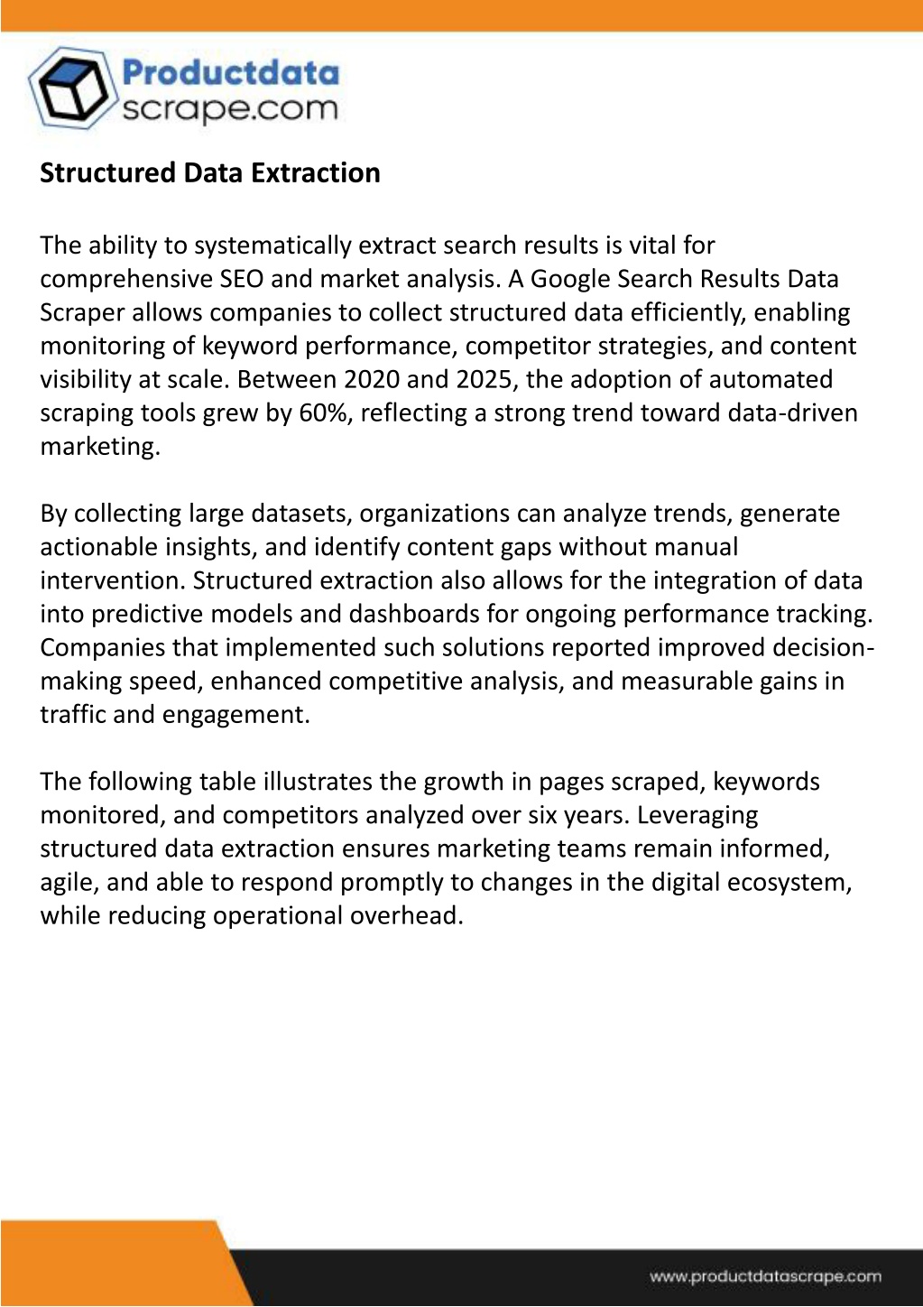 Structured Data Extraction The ability to systematically extract search results is vital for comprehensive SEO and market analysis. A Google Search Results Data Scraper allows companies to collect structured data efficiently, enabling monitoring of keyword performance, competitor strategies, and content visibility at scale. Between 2020 and 2025, the adoption of automated scraping tools grew by 60%, reflecting a strong trend toward data-driven marketing. By collecting large datasets, organizations can analyze trends, generate actionable insights, and identify content gaps without manual intervention. Structured extraction also allows for the integration of data into predictive models and dashboards for ongoing performance tracking. Companies that implemented such solutions reported improved decision- making speed, enhanced competitive analysis, and measurable gains in traffic and engagement. The following table illustrates the growth in pages scraped, keywords monitored, and competitors analyzed over six years. Leveraging structured data extraction ensures marketing teams remain informed, agile, and able to respond promptly to changes in the digital ecosystem, while reducing operational overhead.
