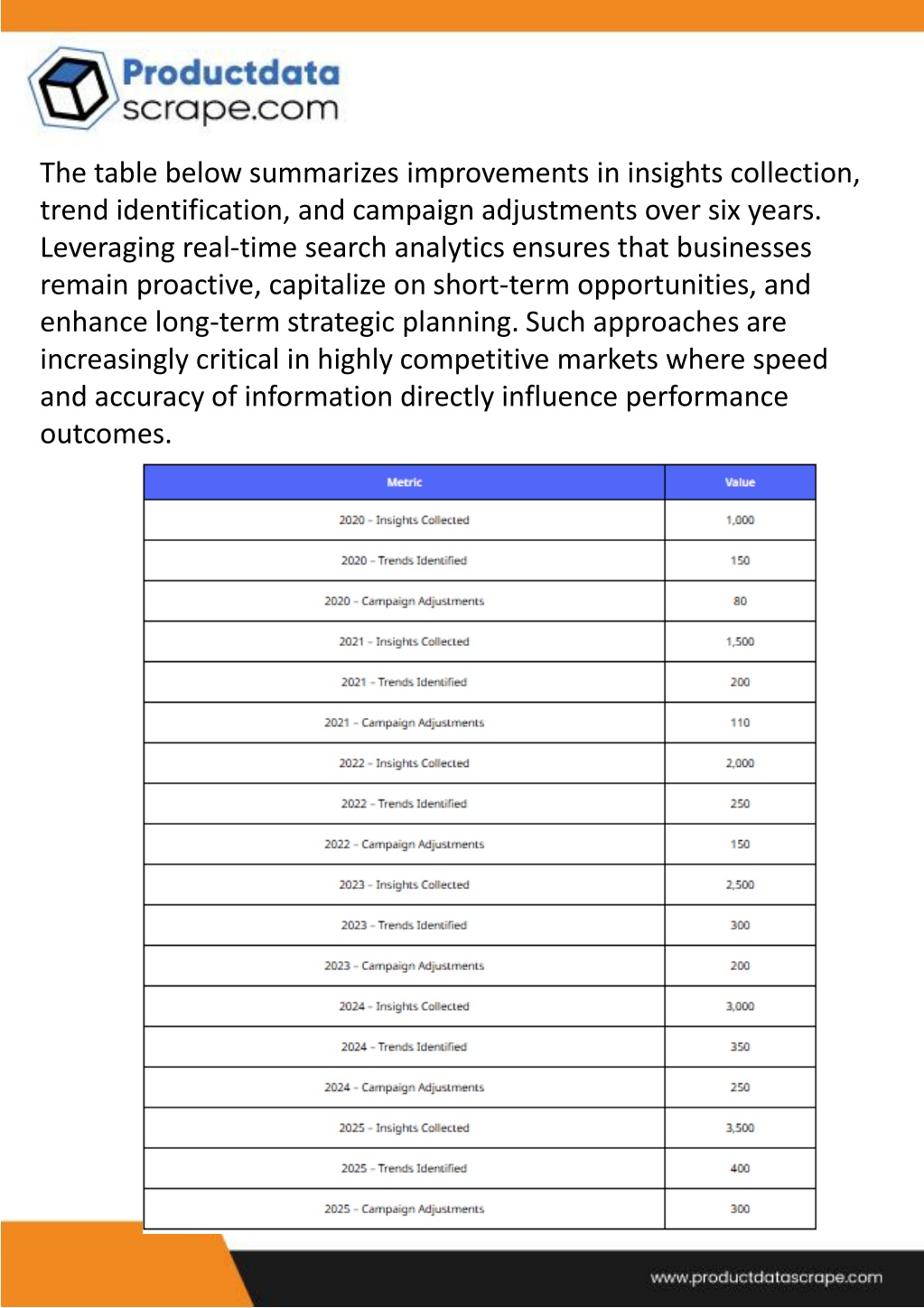 The table below summarizes improvements in insights collection, trend identification, and campaign adjustments over six years. Leveraging real-time search analytics ensures that businesses remain proactive, capitalize on short-term opportunities, and enhance long-term strategic planning. Such approaches are increasingly critical in highly competitive markets where speed and accuracy of information directly influence performance outcomes.