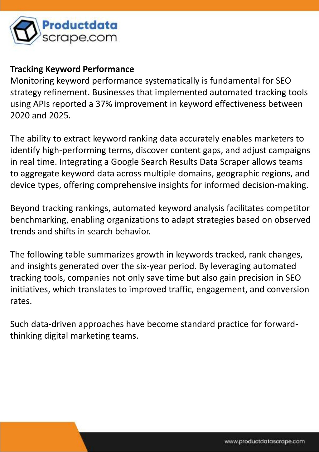 Tracking Keyword Performance Monitoring keyword performance systematically is fundamental for SEO strategy refinement. Businesses that implemented automated tracking tools using APIs reported a 37% improvement in keyword effectiveness between 2020 and 2025. The ability to extract keyword ranking data accurately enables marketers to identify high-performing terms, discover content gaps, and adjust campaigns in real time. Integrating a Google Search Results Data Scraper allows teams to aggregate keyword data across multiple domains, geographic regions, and device types, offering comprehensive insights for informed decision-making. Beyond tracking rankings, automated keyword analysis facilitates competitor benchmarking, enabling organizations to adapt strategies based on observed trends and shifts in search behavior. The following table summarizes growth in keywords tracked, rank changes, and insights generated over the six-year period. By leveraging automated tracking tools, companies not only save time but also gain precision in SEO initiatives, which translates to improved traffic, engagement, and conversion rates. Such data-driven approaches have become standard practice for forward- thinking digital marketing teams.