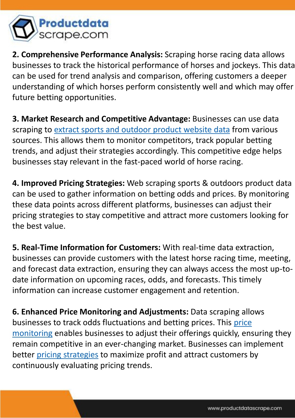 2. Comprehensive Performance Analysis: Scraping horse racing data allows businesses to track the historical performance of horses and jockeys. This data can be used for trend analysis and comparison, offering customers a deeper understanding of which horses perform consistently well and which may offer future betting opportunities. 3. Market Research and Competitive Advantage: Businesses can use data scraping to extract sports and outdoor product website data from various sources. This allows them to monitor competitors, track popular betting trends, and adjust their strategies accordingly. This competitive edge helps businesses stay relevant in the fast-paced world of horse racing. 4. Improved Pricing Strategies: Web scraping sports & outdoors product data can be used to gather information on betting odds and prices. By monitoring these data points across different platforms, businesses can adjust their pricing strategies to stay competitive and attract more customers looking for the best value. 5. Real-Time Information for Customers: With real-time data extraction, businesses can provide customers with the latest horse racing time, meeting, and forecast data extraction, ensuring they can always access the most up-to-date information on upcoming races, odds, and forecasts. This timely information can increase customer engagement and retention. 6. Enhanced Price Monitoring and Adjustments: Data scraping allows businesses to track odds fluctuations and betting prices. This price monitoring enables businesses to adjust their offerings quickly, ensuring they remain competitive in an ever-changing market. Businesses can implement better pricing strategies to maximize profit and attract customers by continuously evaluating pricing trends.