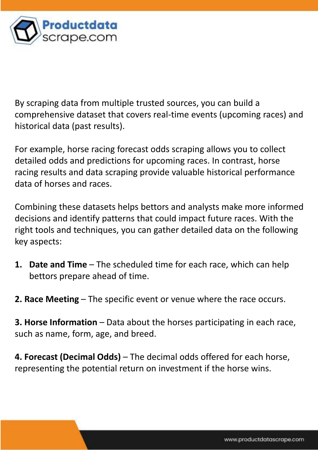 Odds fluctuate constantly based on market dynamics, public betting activity, and horse performance reports. Scraping this data allows analysts to study odds movements over time, identifying patterns or correlations between market sentiment and race outcomes. Why Businesses Prefer Scraping Horse Racing Data? Here are six detailed points on why businesses prefer scraping horse racing data: Accurate Betting Predictions: By using horse racing time, meeting, and forecast data extraction, businesses can collect real-time race information, which is crucial for making accurate betting predictions. This helps them offer valuable insights to customers, leading to better decision-making in betting strategies.