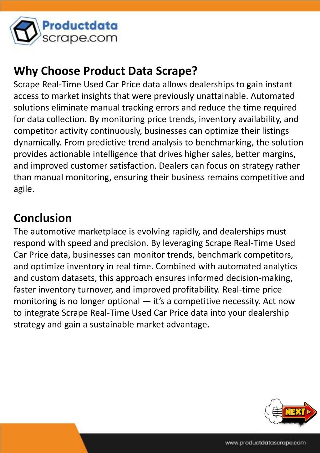 5. Why Choose Product Data Scrape? Scrape Real-Time Used Car Price data allows dealerships to gain instant access to market insights that were previously unattainable. Automated solutions eliminate manual tracking errors and reduce the time required for data collection. By monitoring price trends, inventory availability, and competitor activity continuously, businesses can optimize their listings dynamically. From predictive trend analysis to benchmarking, the solution provides actionable intelligence that drives higher sales, better margins, and improved customer satisfaction. Dealers can focus on strategy rather than manual monitoring, ensuring their business remains competitive and agile. Conclusion The automotive marketplace is evolving rapidly, and dealerships must respond with speed and precision. By leveraging Scrape Real-Time Used Car Price data, businesses can monitor trends, benchmark competitors, and optimize inventory in real time. Combined with automated analytics and custom datasets, this approach ensures informed decision-making, faster inventory turnover, and improved profitability. Real-time price monitoring is no longer optional —it’s a competitive necessity. Act now to integrate Scrape Real-Time Used Car Price data into your dealership strategy and gain a sustainable market advantage.