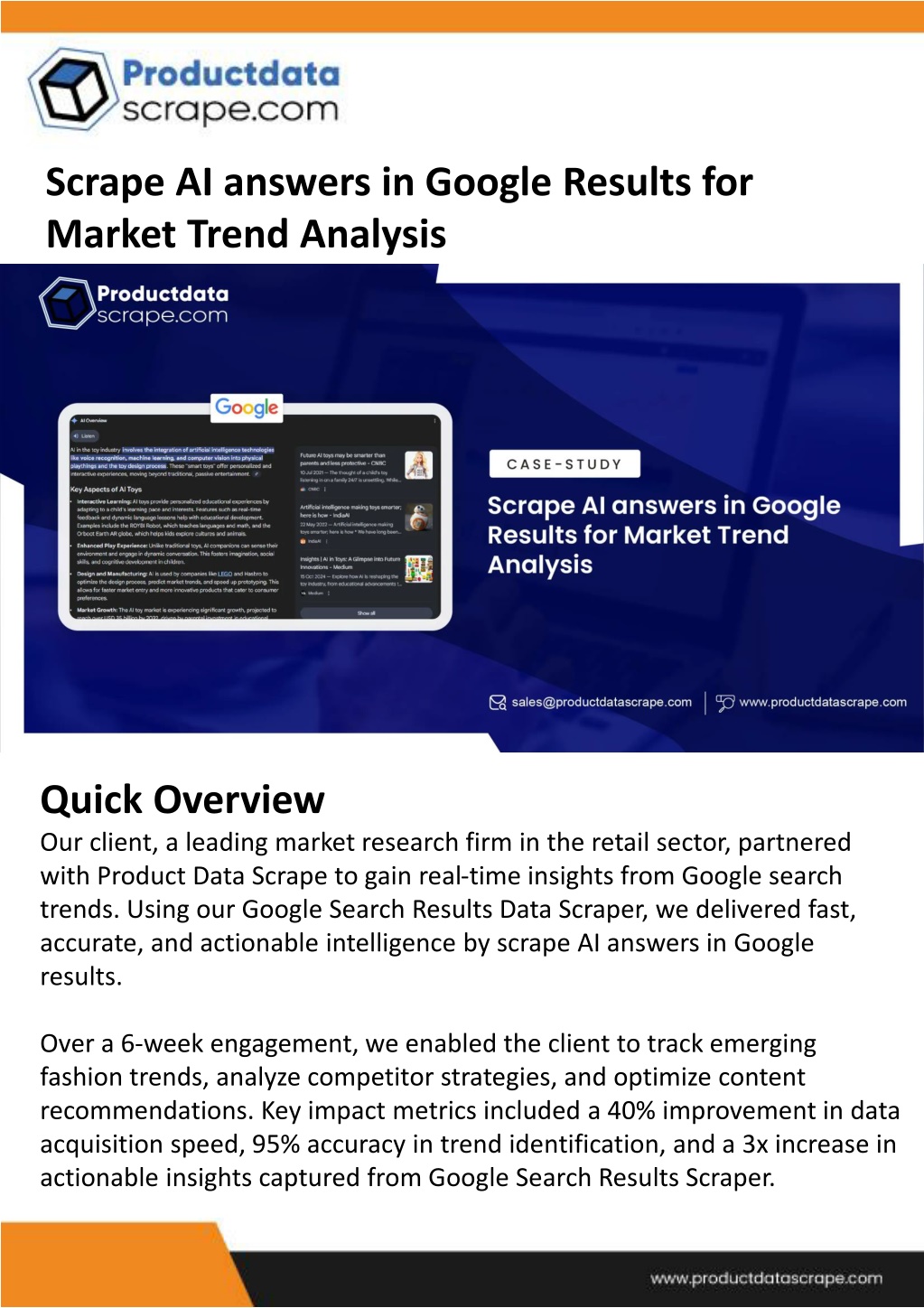 Unlike manual approaches, our solution scaled seamlessly across thousands of queries, integrated directly with client dashboards, and minimized human intervention. Intelligent scheduling, data normalization, and robust error handling created a truly reliable platform for market trend analysis, giving the client a competitive edge in real-time insights and decision-making Client’s Testimonial "Working with Product Data Scrape transformed the way we monitor market trends. Their Google Search Results Data Scraper provided highly accurate insights from AI-generated Google results, dramatically reducing manual effort. The automation pipelines allowed us to scale operations and make faster, data-driven decisions. The team’s expertise in handling dynamic web content and integrating real-time Google search data scraper outputs directly into our systems exceeded our expectations. This solution has become an essential part of our strategy for competitor monitoring, trend forecasting, and content optimization." -Head of Market Research, Trend Insights Ltd. Conclusion By implementing a fully automated solution to scrape AI answers in Google results, Product Data Scrape enabled the client to gain actionable, real-time market insights. Leveraging the Web Data Intelligence API and Google Search Scraper API, the client achieved faster trend detection, improved accuracy, and scalable operations. The solution not only streamlined data extraction but also empowered strategic decisions across product launches, marketing, and content optimization. This case study demonstrates the power of combining AI-driven web data with advanced automation to deliver competitive advantage in a rapidly evolving market landscape.