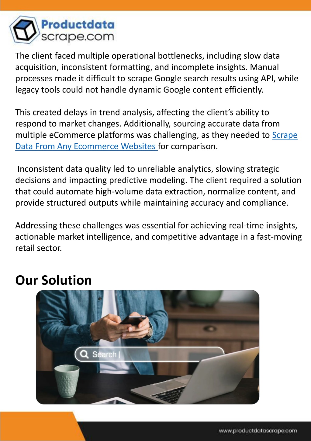 The client faced multiple operational bottlenecks, including slow data acquisition, inconsistent formatting, and incomplete insights. Manual processes made it difficult to scrape Google search results using API, while legacy tools could not handle dynamic Google content efficiently. • This created delays in trend analysis, affecting the client’s ability to respond to market changes. Additionally, sourcing accurate data from multiple eCommerce platforms was challenging, as they needed to Scrape Data From Any Ecommerce Websites for comparison. • Inconsistent data quality led to unreliable analytics, slowing strategic decisions and impacting predictive modeling. The client required a solution that could automate high-volume data extraction, normalize content, and provide structured outputs while maintaining accuracy and compliance. • Addressing these challenges was essential for achieving real-time insights, actionable market intelligence, and competitive advantage in a fast-moving retail sector. • Our Solution