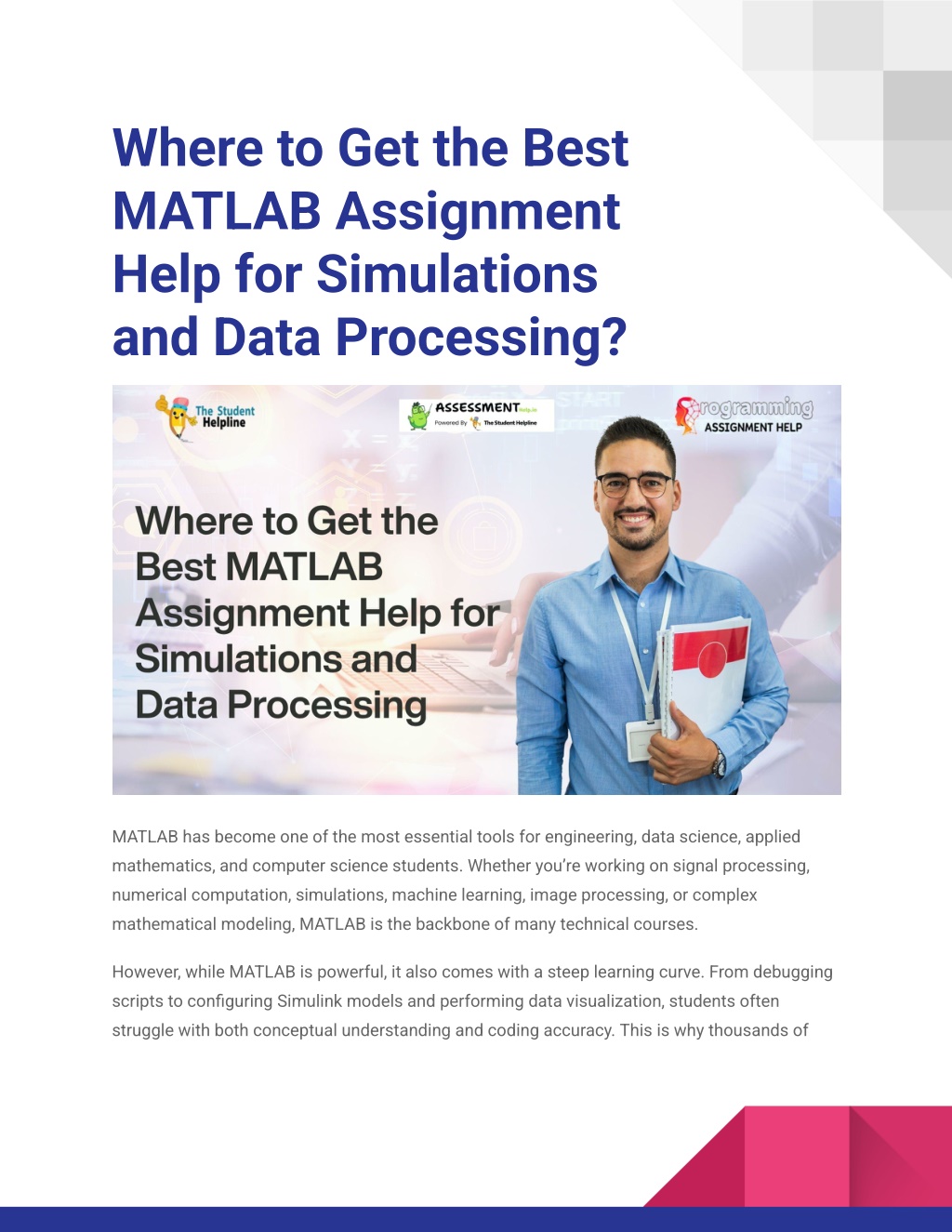 12 ✅ 5. Fast Delivery for Urgent Assignments Students facing tight deadlines can request same-day MATLAB guidance. CONCLUSION MATLAB is one of the most powerful tools in modern education—but its mathematical depth, coding complexity, and simulation requirements make it challenging. Students around the world rely on MATLAB Assignment Help to gain confidence and submit accurate, high-quality work. Platforms like The Student Helpline, Assessment Help, and Programming Assignment Help provide expert-level clarity, error-free code, simulation support, and step-by-step explanations. With the right guidance, students can master MATLAB, improve grades, and strengthen their engineering and analytical skills. FAQs: 1. What is MATLAB Assignment Help? MATLAB Assignment Help provides expert assistance with coding, simulations, data analysis, modeling, and solving engineering or mathematical problems using MATLAB. 2. Why do students struggle with MATLAB assignments? Students face difficulty due to MATLAB’s complex math, coding errors, toolbox specialization, Simulink modeling, and time-consuming debugging. 3. What topics are covered under MATLAB assignment help? Support includes MATLAB scripting, functions, ODE/PDE solving, Simulink models, data visualization, machine learning, signal processing, and optimization.