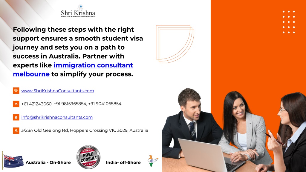 14. www.ShriKrishnaConsultants.com • +61 421243060 Following these steps with the right support ensures a smooth student visa journey and sets you on a path to success inAustralia. Partner with experts like immigration consultant melbourne to simplify your process. • info@shrikrishnaconsultants.com • 3/23A Old Geelong Rd, Hoppers Crossing VIC 3029, Australia • +91 9815965854, +91 9041065854 Australia - On-Shore India- off-Shore