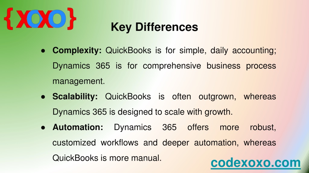 Key Differences • Complexity: QuickBooks is for simple, daily accounting; Dynamics 365 is for comprehensive business process management. • Scalability: QuickBooks is often outgrown, whereas Dynamics 365 is designed to scale with growth. • Automation: Dynamics 365 offers more robust, customized workflows and deeper automation, whereas QuickBooks is more manual. codexoxo.com