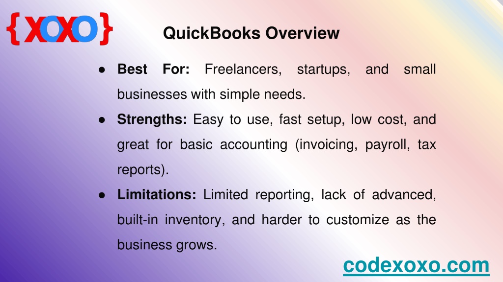 QuickBooks Overview • Best For: Freelancers, startups, and small businesses with simple needs. • Strengths: Easy to use, fast setup, low cost, and great for basic accounting (invoicing, payroll, tax reports). • Limitations: Limited reporting, lack of advanced, built-in inventory, and harder to customize as the business grows. codexoxo.com
