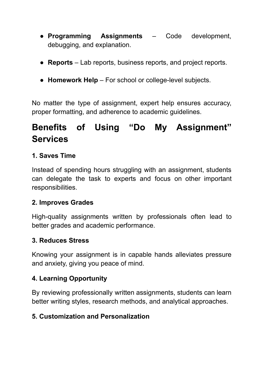 ● Programming debugging, and explanation. ● Reports – Lab reports, business reports, and project reports. ● Homework Help – For school or college-level subjects. Assignments – Code development, No matter the type of assignment, expert help ensures accuracy, proper formatting, and adherence to academic guidelines. Benefits of Using “Do My Assignment” Services 1. Saves Time Instead of spending hours struggling with an assignment, students can delegate the task to experts and focus on other important responsibilities. 2. Improves Grades High-quality assignments written by professionals often lead to better grades and academic performance. 3. Reduces Stress Knowing your assignment is in capable hands alleviates pressure and anxiety, giving you peace of mind. 4. Learning Opportunity By reviewing professionally written assignments, students can learn better writing styles, research methods, and analytical approaches. 5. Customization and Personalization