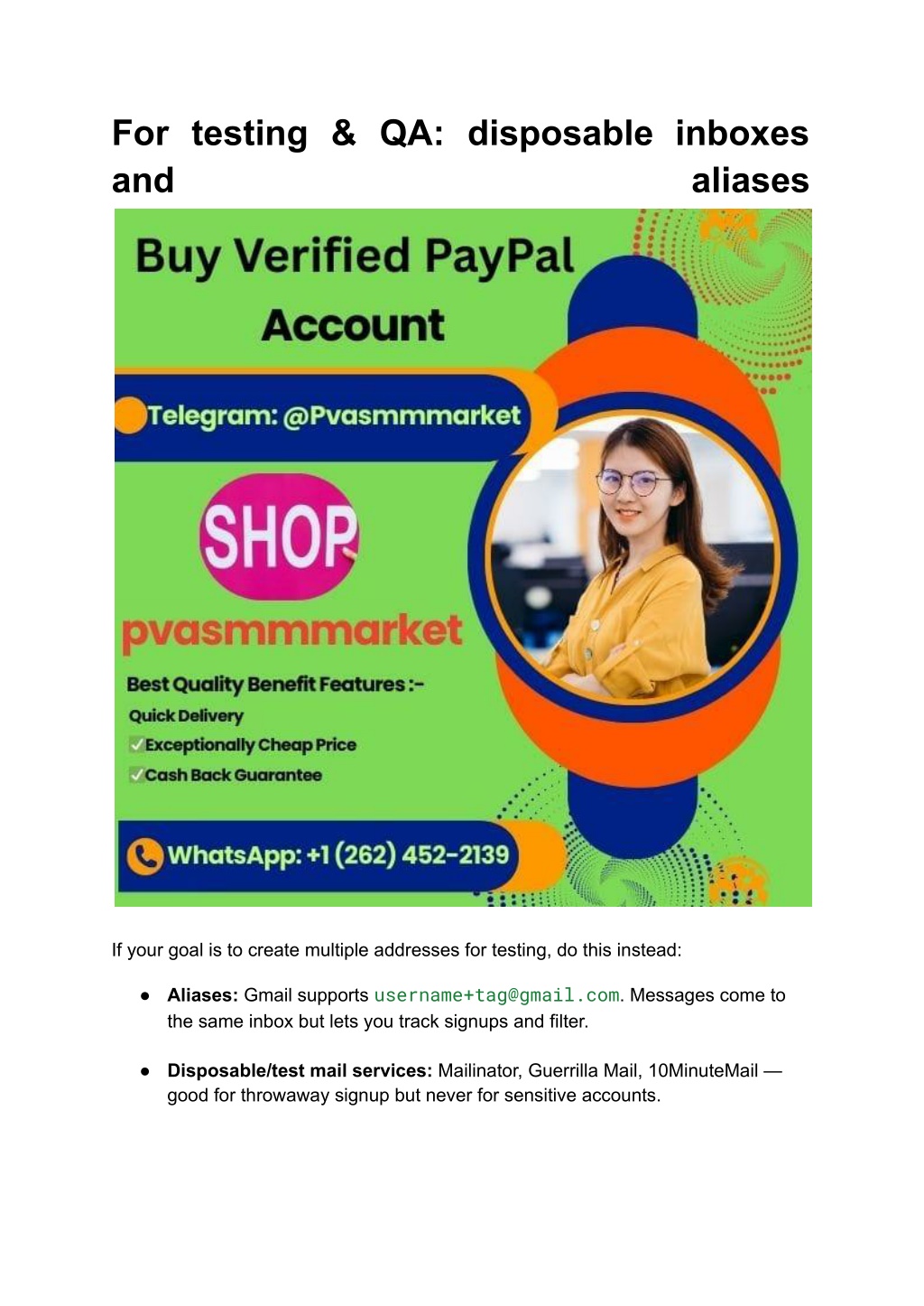 10. For testing & QA: disposable inboxes and aliases If your goal is to create multiple addresses for testing, do this instead: ● Aliases: Gmail supports username+tag@gmail.com. Messages come to the same inbox but lets you track signups and filter. ● Disposable/test mail services: Mailinator, Guerrilla Mail, 10MinuteMail — good for throwaway signup but never for sensitive accounts.