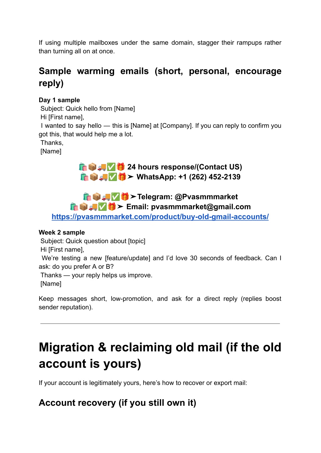 8. If using multiple mailboxes under the same domain, stagger their rampups rather than turning all on at once. Sample warming emails (short, personal, encourage reply) Day 1 sample Subject: Quick hello from [Name] Hi [First name], I wanted to say hello — this is [Name] at [Company]. If you can reply to confirm you got this, that would help me a lot. Thanks, [Name] ???✅? 24 hours response/(Contact US) ???✅?➤ WhatsApp: +1 (262) 452-2139 ???✅?➤Telegram: @Pvasmmmarket ???✅?➤ Email: pvasmmmarket@gmail.com https://pvasmmmarket.com/product/buy-old-gmail-accounts/ Week 2 sample Subject: Quick question about [topic] Hi [First name], We’re testing a new [feature/update] and I’d love 30 seconds of feedback. Can I ask: do you prefer A or B? Thanks — your reply helps us improve. [Name] Keep messages short, low-promotion, and ask for a direct reply (replies boost sender reputation). Migration & reclaiming old mail (if the old account is yours) If your account is legitimately yours, here’s how to recover or export mail: Account recovery (if you still own it)