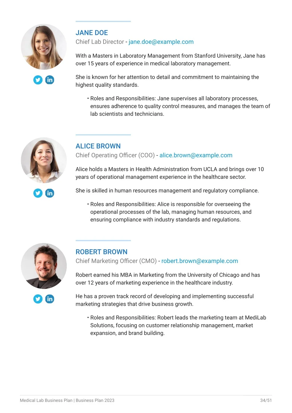 JANE DOE Chief Lab Director - jane.doe@example.com With a Masters in Laboratory Management from Stanford University, Jane has over 15 years of experience in medical laboratory management. She is known for her attention to detail and commitment to maintaining the highest quality standards. • Roles and Responsibilities: Jane supervises all laboratory processes, ensures adherence to quality control measures, and manages the team of lab scientists and technicians. ALICE BROWN Chief Operating Officer (COO) - alice.brown@example.com Alice holds a Masters in Health Administration from UCLA and brings over 10 years of operational management experience in the healthcare sector. She is skilled in human resources management and regulatory compliance. • Roles and Responsibilities: Alice is responsible for overseeing the operational processes of the lab, managing human resources, and ensuring compliance with industry standards and regulations. ROBERT BROWN Chief Marketing Officer (CMO) - robert.brown@example.com Robert earned his MBA in Marketing from the University of Chicago and has over 12 years of marketing experience in the healthcare industry. He has a proven track record of developing and implementing successful marketing strategies that drive business growth. • Roles and Responsibilities: Robert leads the marketing team at MediLab Solutions, focusing on customer relationship management, market expansion, and brand building. Medical Lab Business Plan | Business Plan 2023 34/51