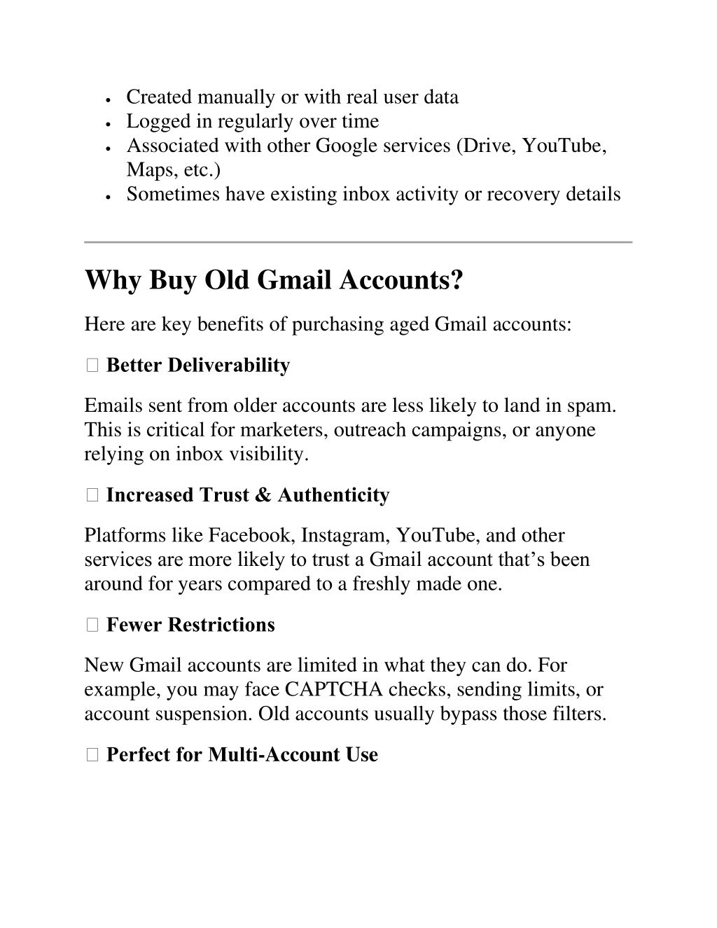 2. Created manually or with real user data Logged in regularly over time Associated with other Google services (Drive, YouTube, Maps, etc.) Sometimes have existing inbox activity or recovery details Why Buy Old Gmail Accounts? Here are key benefits of purchasing aged Gmail accounts: ✅ Better Deliverability Emails sent from older accounts are less likely to land in spam. This is critical for marketers, outreach campaigns, or anyone relying on inbox visibility. ✅ Increased Trust & Authenticity Platforms like Facebook, Instagram, YouTube, and other services are more likely to trust a Gmail account that’s been around for years compared to a freshly made one. ✅ Fewer Restrictions New Gmail accounts are limited in what they can do. For example, you may face CAPTCHA checks, sending limits, or account suspension. Old accounts usually bypass those filters. ✅ Perfect for Multi-Account Use