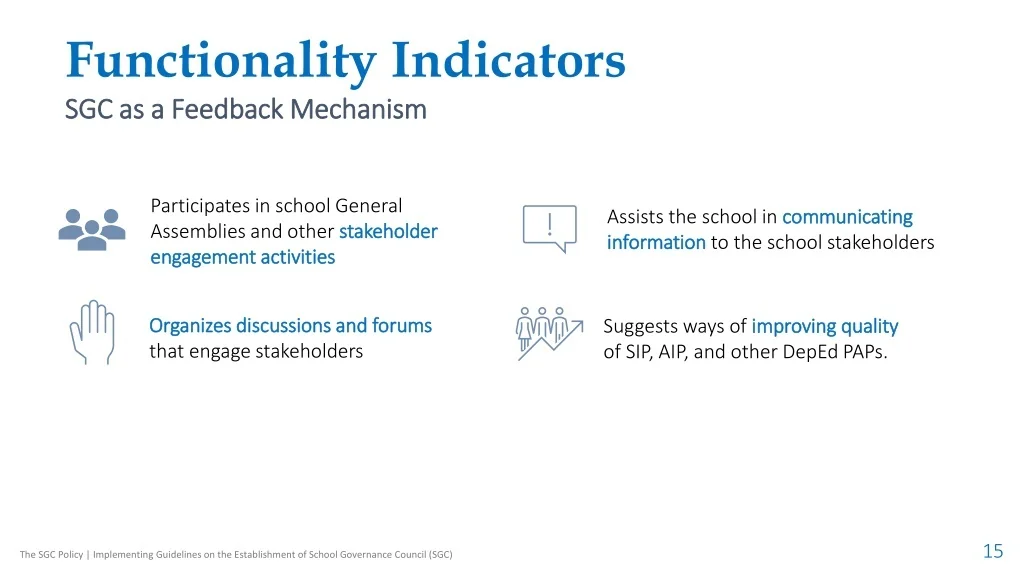 Functionality IndicatorsSGC as a Feedback Mechanism Suggests ways of improving qualityof SIP, AIP, and other DepEd PAPs. Participates in school General Assemblies and other stakeholder engagement activities Assists the school in communicating information to the school stakeholders Organizes discussions and forumsthat engage stakeholders The SGC Policy | Implementing Guidelines on the Establishment of School Governance Council (SGC)
