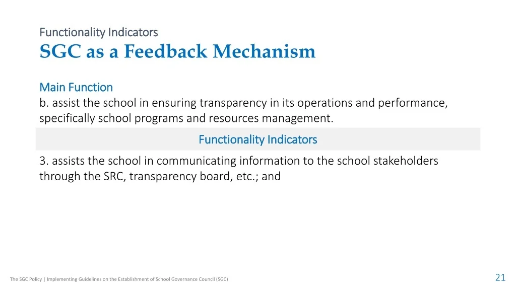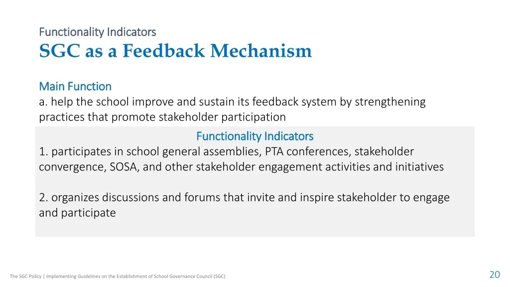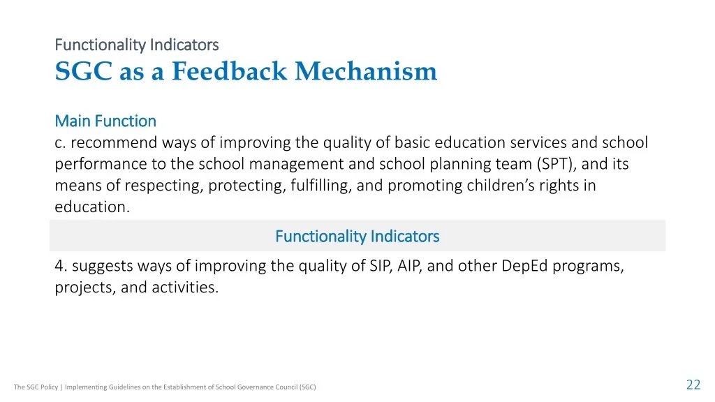 Functionality IndicatorsSGC as a Feedback Mechanism The SGC Policy | Implementing Guidelines on the Establishment of School Governance Council (SGC)