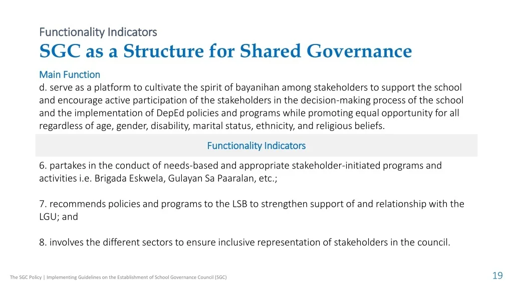 Functionality IndicatorsSGC as a Structure for Shared Governance The SGC Policy | Implementing Guidelines on the Establishment of School Governance Council (SGC)