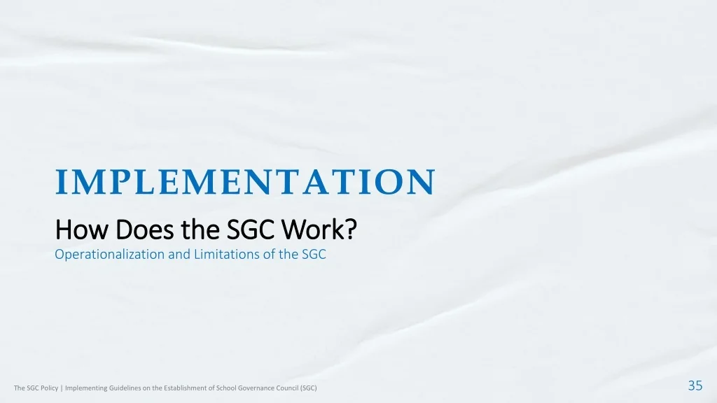 IMPLEMENTATION How Does the SGC Work?Operationalization and Limitations of the SGC The SGC Policy | Implementing Guidelines on the Establishment of School Governance Council (SGC)