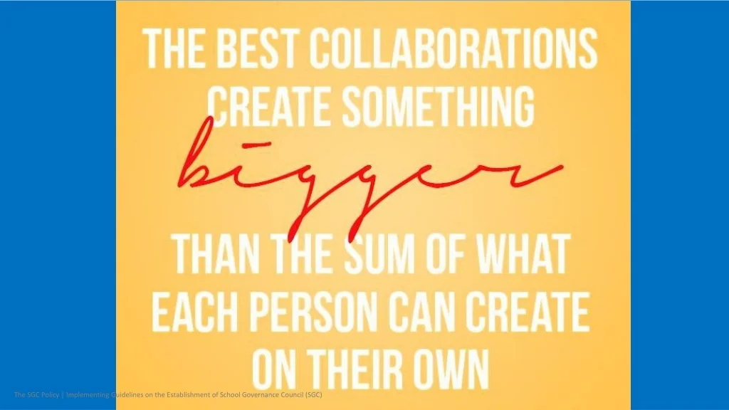 School Governance Council OVERALL COORDINATING BODYof different school committees to • synergize • harmonize • put together their work to ensurealignment and achievement of goals The SGC Policy | Implementing Guidelines on the Establishment of School Governance Council (SGC)