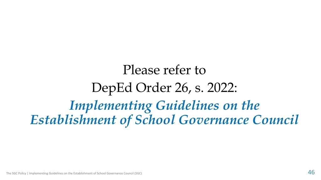 The SGC Policy | Implementing Guidelines on the Establishment of School Governance Council (SGC) Please refer to DepEd Order 26, s. 2022: Implementing Guidelines on the Establishment of School Governance Council