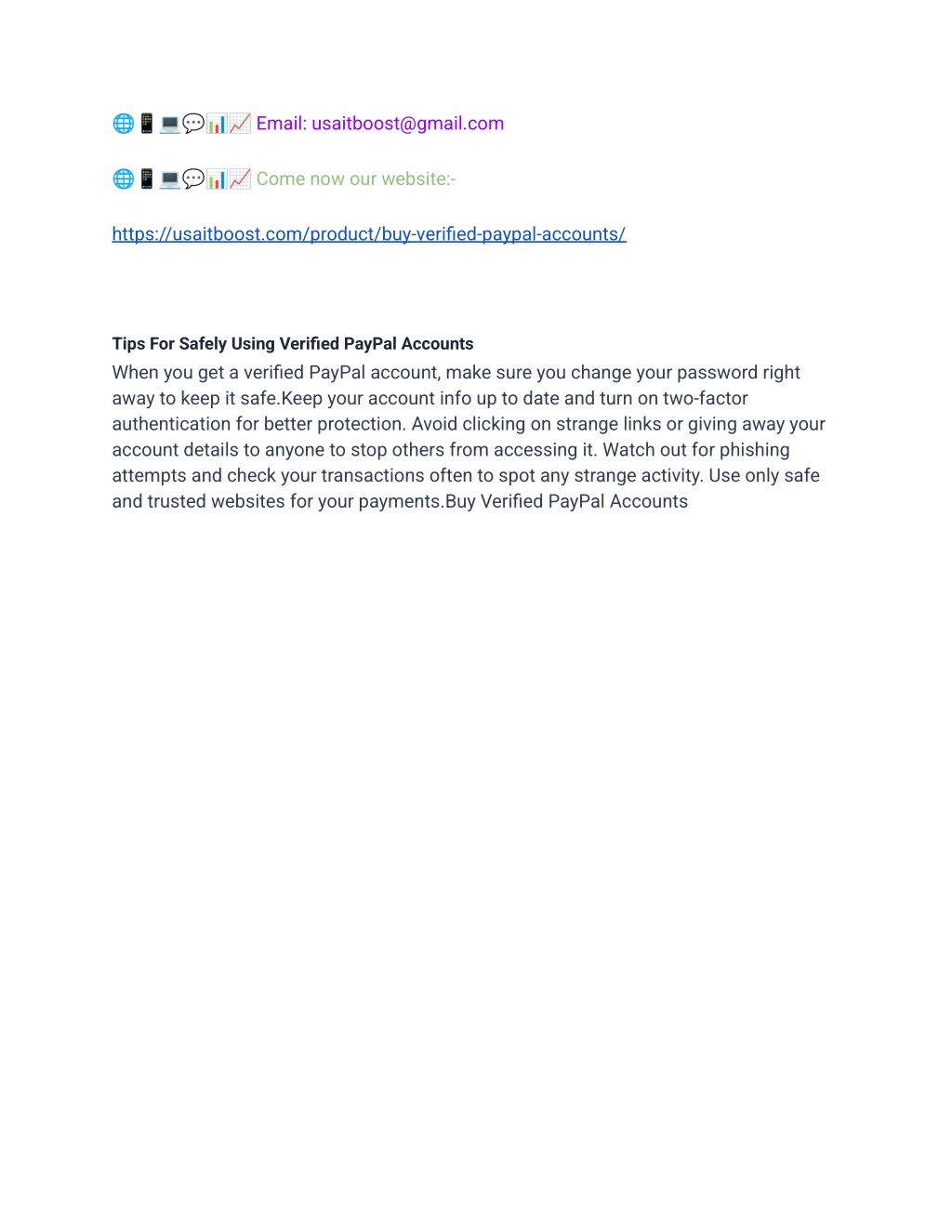 ?????? Email: usaitboost@gmail.com ?????? Come now our website:- https://usaitboost.com/product/buy-verified-paypal-accounts/ Tips For Safely Using Verified PayPal Accounts When you get a verified PayPal account, make sure you change your password right away to keep it safe.Keep your account info up to date and turn on two-factor authentication for better protection. Avoid clicking on strange links or giving away your account details to anyone to stop others from accessing it. Watch out for phishing attempts and check your transactions often to spot any strange activity. Use only safe and trusted websites for your payments.Buy Verified PayPal Accounts