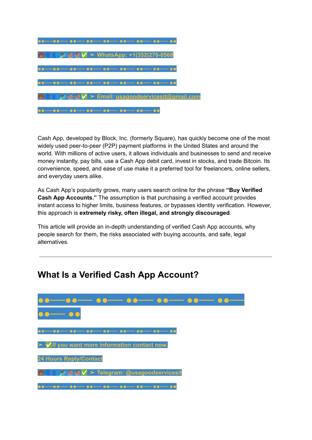 ●●──●●── ●●── ●●── ●●── ●●── ●●── ●●── ●● ??????✅➤ WhatsApp: +1(352)270-0568 ●●──●●── ●●── ●●── ●●── ●●── ●●── ●●── ●● ●●──●●── ●●── ●●── ●●── ●●── ●●── ●●── ●● ??????✅➤ Email: usagoodservicesit@gmail.com ●●──●●── ●●── ●●── ●●── ●●── ●●── ●● Cash App, developed by Block, Inc. (formerly Square), has quickly become one of the most widely used peer-to-peer (P2P) payment platforms in the United States and around the world. With millions of active users, it allows individuals and businesses to send and receive money instantly, pay bills, use a Cash App debit card, invest in stocks, and trade Bitcoin. Its convenience, speed, and ease of use make it a preferred tool for freelancers, online sellers, and everyday users alike. As Cash App’s popularity grows, many users search online for the phrase “Buy Verified Cash App Accounts.” The assumption is that purchasing a verified account provides instant access to higher limits, business features, or bypasses identity verification. However, this approach is extremely risky, often illegal, and strongly discouraged. This article will provide an in-depth understanding of verified Cash App accounts, why people search for them, the risks associated with buying accounts, and safe, legal alternatives. What Is a Verified Cash App Account? ●●──●●── ●●── ●●── ●●── ●●── ●●── ●●── ●● ●●──●●── ●●── ●●── ●●── ●●── ●●── ●●── ●● ➤✅If you want more information contact now. 24 Hours Reply/Contact ??????✅➤ Telegram: @usagoodservicesit ●●──●●── ●●── ●●── ●●── ●●── ●●── ●●── ●●