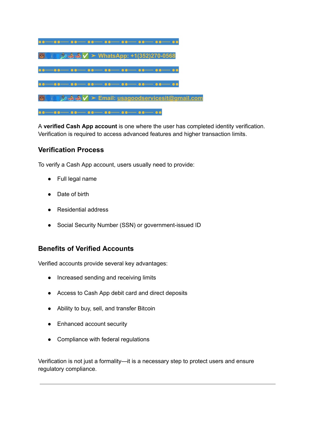 ●●──●●── ●●── ●●── ●●── ●●── ●●── ●●── ●● ??????✅➤ WhatsApp: +1(352)270-0568 ●●──●●── ●●── ●●── ●●── ●●── ●●── ●●── ●● ●●──●●── ●●── ●●── ●●── ●●── ●●── ●●── ●● ??????✅➤ Email: usagoodservicesit@gmail.com ●●──●●── ●●── ●●── ●●── ●●── ●●── ●● A verified Cash App account is one where the user has completed identity verification. Verification is required to access advanced features and higher transaction limits. Verification Process To verify a Cash App account, users usually need to provide: ● Full legal name ● Date of birth ● Residential address ● Social Security Number (SSN) or government-issued ID Benefits of Verified Accounts Verified accounts provide several key advantages: ● Increased sending and receiving limits ● Access to Cash App debit card and direct deposits ● Ability to buy, sell, and transfer Bitcoin ● Enhanced account security ● Compliance with federal regulations Verification is not just a formality—it is a necessary step to protect users and ensure regulatory compliance.