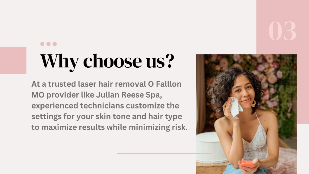 03 Why choose us? At a trusted laser hair removal O Falllon MO provider like Julian Reese Spa, experienced technicians customize the settings for your skin tone and hair type to maximize results while minimizing risk.