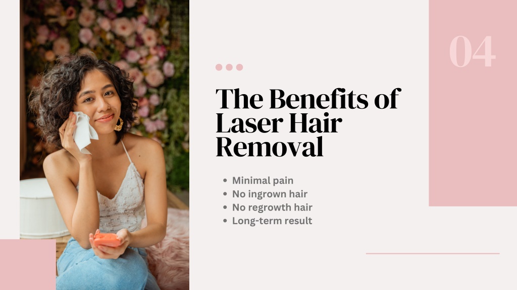 04 The Benefits of Laser Hair Removal Minimal pain No ingrown hair No regrowth hair Long-term result