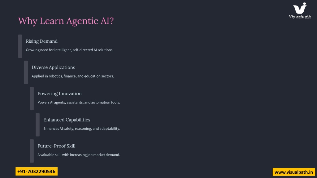 Why Learn Agentic AI? Rising Demand Growing need for intelligent, self-directed AI solutions. Diverse Applications Applied in robotics, finance, and education sectors. Powering Innovation Powers AI agents, assistants, and automation tools. Enhanced Capabilities Enhances AI safety, reasoning, and adaptability. Future-Proof Skill A valuable skill with increasing job market demand. +91-7032290546 www.visualpath.in