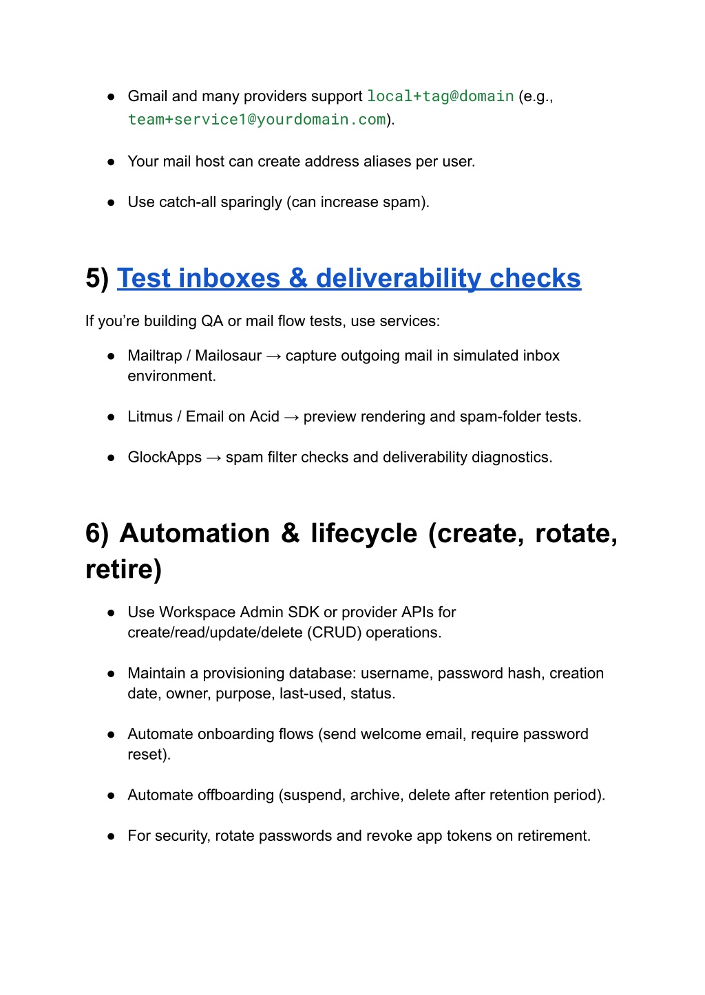 8. ● Gmail and many providers support local+tag@domain (e.g., team+service1@yourdomain.com). ● Your mail host can create address aliases per user. ● Use catch-all sparingly (can increase spam). 5) Test inboxes & deliverability checks If you’re building QA or mail flow tests, use services: ● Mailtrap / Mailosaur → capture outgoing mail in simulated inbox environment. ● Litmus / Email on Acid → preview rendering and spam-folder tests. ● GlockApps → spam filter checks and deliverability diagnostics. 6) Automation & lifecycle (create, rotate, retire) ● Use Workspace Admin SDK or provider APIs for create/read/update/delete (CRUD) operations. ● Maintain a provisioning database: username, password hash, creation date, owner, purpose, last-used, status. ● Automate onboarding flows (send welcome email, require password reset). ● Automate offboarding (suspend, archive, delete after retention period). ● For security, rotate passwords and revoke app tokens on retirement.