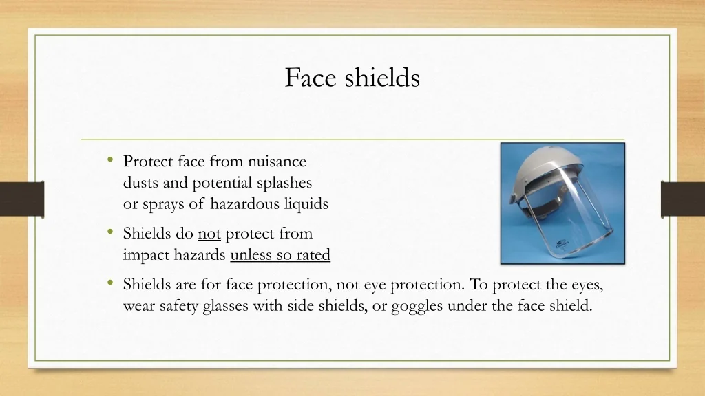 21. Face shields • Protect face from nuisance dusts and potential splashes or sprays of hazardous liquids • Shields do not protect from impact hazards unless so rated • Shields are for face protection, not eye protection. To protect the eyes, wear safety glasses with side shields, or goggles under the face shield.