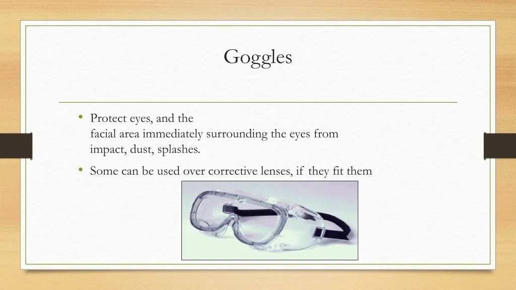 19. Goggles • Protect eyes, and the facial area immediately surrounding the eyes from impact, dust, splashes. • Some can be used over corrective lenses, if they fit them