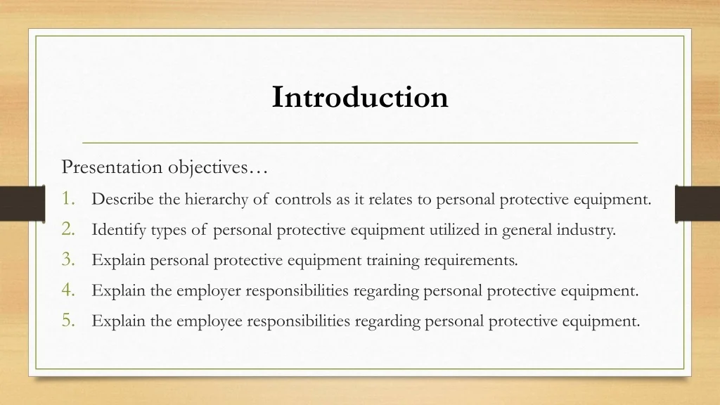 3. Introduction Presentation objectives… • Describe the hierarchy of controls as it relates to personal protective equipment. • Identify types of personal protective equipment utilized in general industry. • Explain personal protective equipment training requirements. • Explain the employer responsibilities regarding personal protective equipment. • Explain the employee responsibilities regarding personal protective equipment.