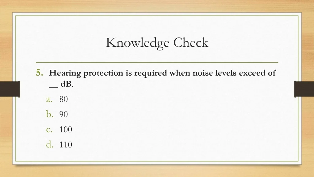 47. Knowledge Check • Hearing protection is required when noise levels exceed of __ dB. • 80 • 90 • 100 • 110
