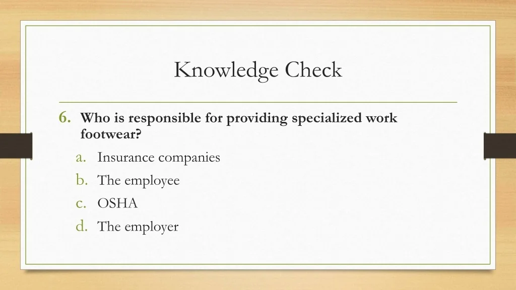 48. Knowledge Check • Who is responsible for providing specialized work footwear? • Insurance companies • The employee • OSHA • The employer