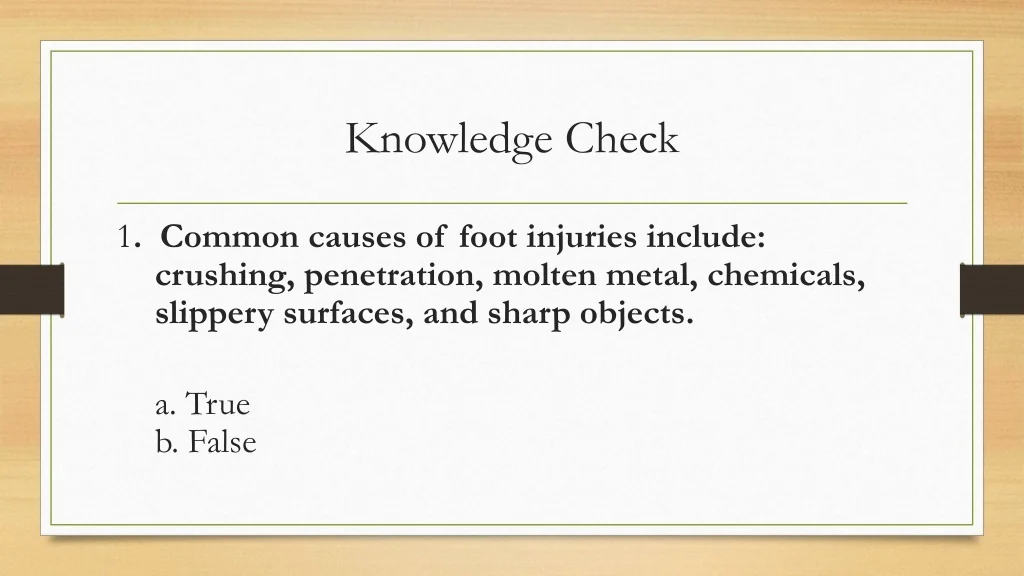 43. Knowledge Check 1. Common causes of foot injuries include: crushing, penetration, molten metal, chemicals, slippery surfaces, and sharp objects. a. True b. False