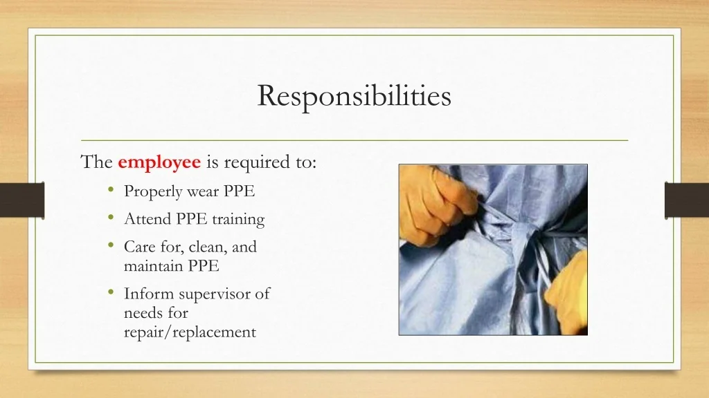 42. Responsibilities The employeeis required to: • Properly wear PPE • Attend PPE training • Care for, clean, and maintain PPE • Inform supervisor of needs for repair/replacement