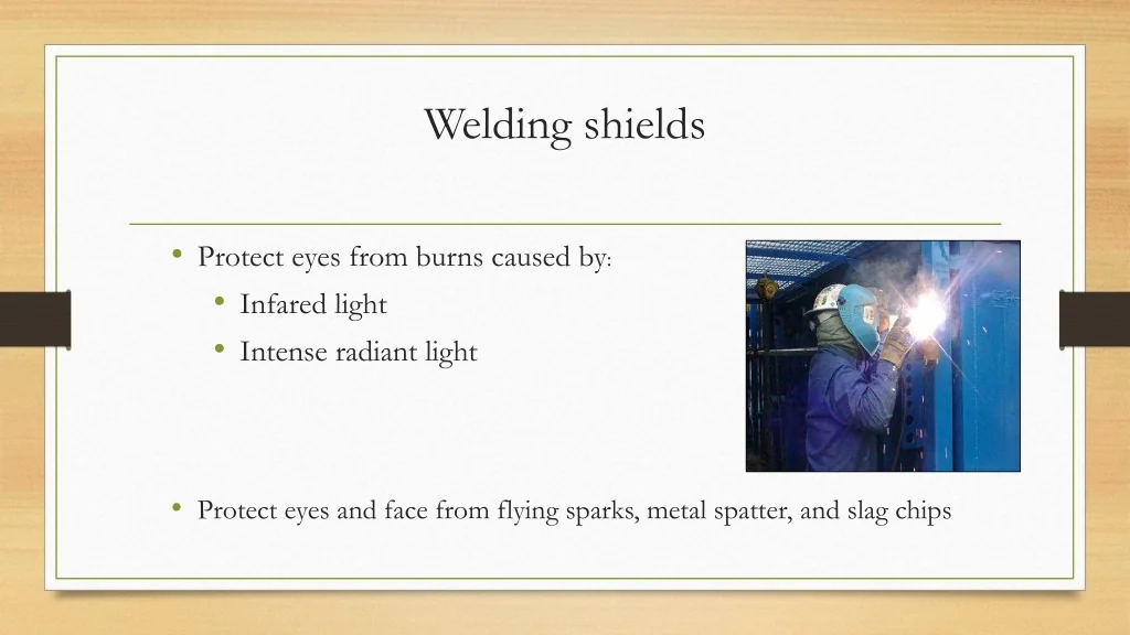 22. Welding shields • Protect eyes from burns caused by: • Infared light • Intense radiant light • Protect eyes and face from flying sparks, metal spatter, and slag chips
