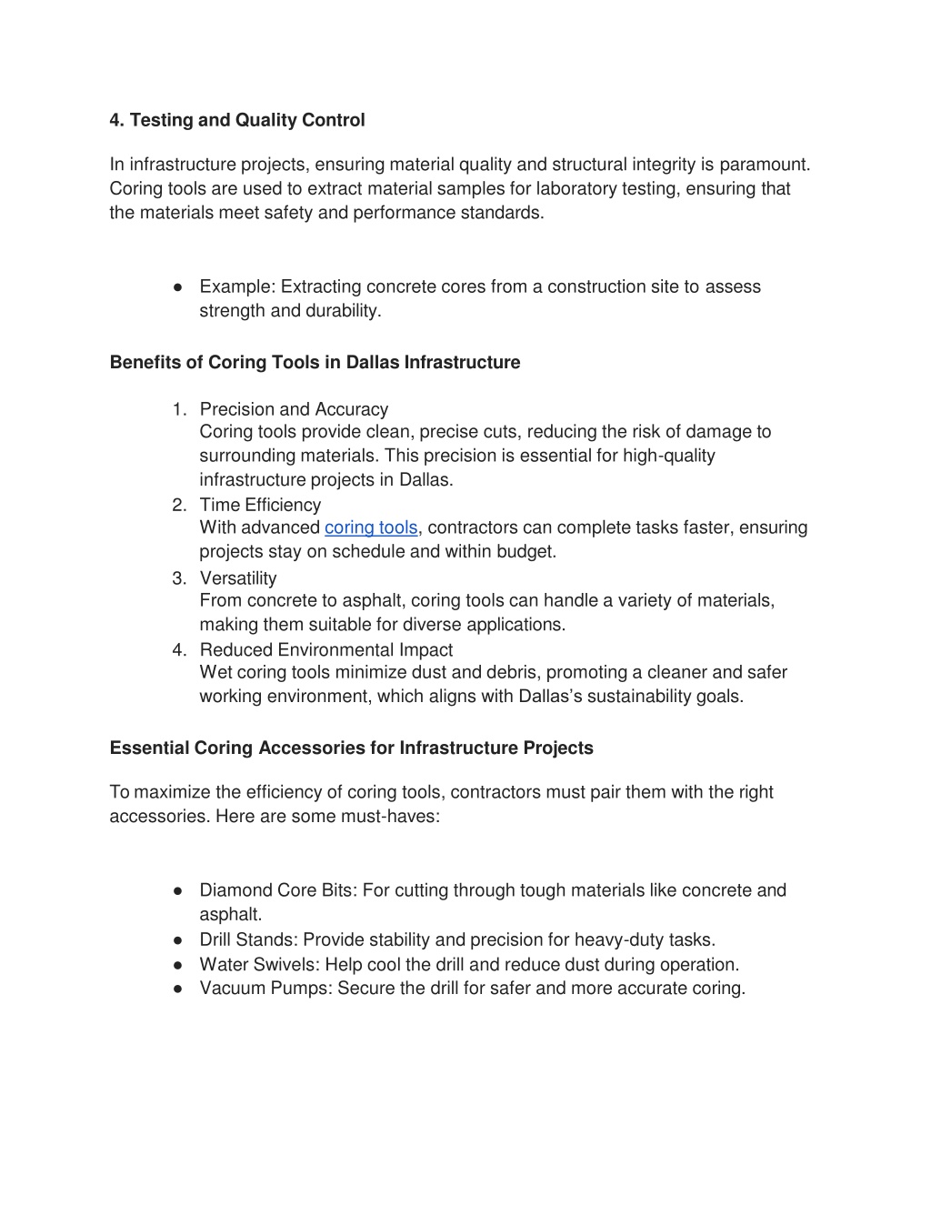 reliability of coring tools have become indispensable. • ApplicationsofCoringToolsinDallasInfrastructure • UtilityInstallation • Coring tools are widely used to create openings for utilities such as water pipes, electricalconduits, andfiber opticcables. WithDallas’s growingpopulation and increasing demand for modern amenities, the need for precise utility installation is greater than ever. • Example: Drilling cores in concrete walls for electrical wiring in new residential developments. • RoadandBridge Construction • Theconstruction of roads, highways, and bridges is a cornerstone of Dallas’s infrastructuregrowth.Coringtoolsare usedtocreateholesfor drainagesystems,test material strength, and insert structural reinforcements. • Example:Drilling intoasphalt to testits quality fordurability and safety compliance. • CommercialandResidential Projects • For high-rise buildings and modern commercial complexes, coring tools ensure precisionwhencreatingspacesforelevators, HVAC systems,andfiresuppression systems.Residentialprojectsalsorelyoncoringtoolsforefficientandseamless installations. • Example: Coring through floors to install plumbing systems in multi-story buildings.