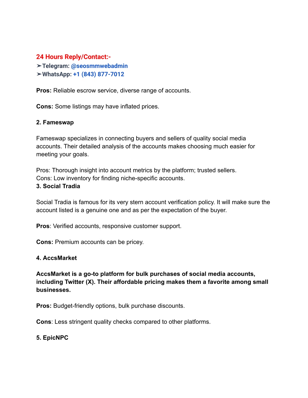 24 Hours Reply/Contact:- ➤Telegram: @seosmmwebadmin ➤WhatsApp: +1 (843) 877-7012 Pros: Reliable escrow service, diverse range of accounts. Cons: Some listings may have inflated prices. 2. Fameswap Fameswap specializes in connecting buyers and sellers of quality social media accounts. Their detailed analysis of the accounts makes choosing much easier for meeting your goals. Pros: Thorough insight into account metrics by the platform; trusted sellers. Cons: Low inventory for finding niche-specific accounts. 3. Social Tradia Social Tradia is famous for its very stern account verification policy. It will make sure the account listed is a genuine one and as per the expectation of the buyer. Pros: Verified accounts, responsive customer support. Cons: Premium accounts can be pricey. 4. AccsMarket AccsMarket is a go-to platform for bulk purchases of social media accounts, including Twitter (X). Their affordable pricing makes them a favorite among small businesses. Pros: Budget-friendly options, bulk purchase discounts. Cons: Less stringent quality checks compared to other platforms. 5. EpicNPC