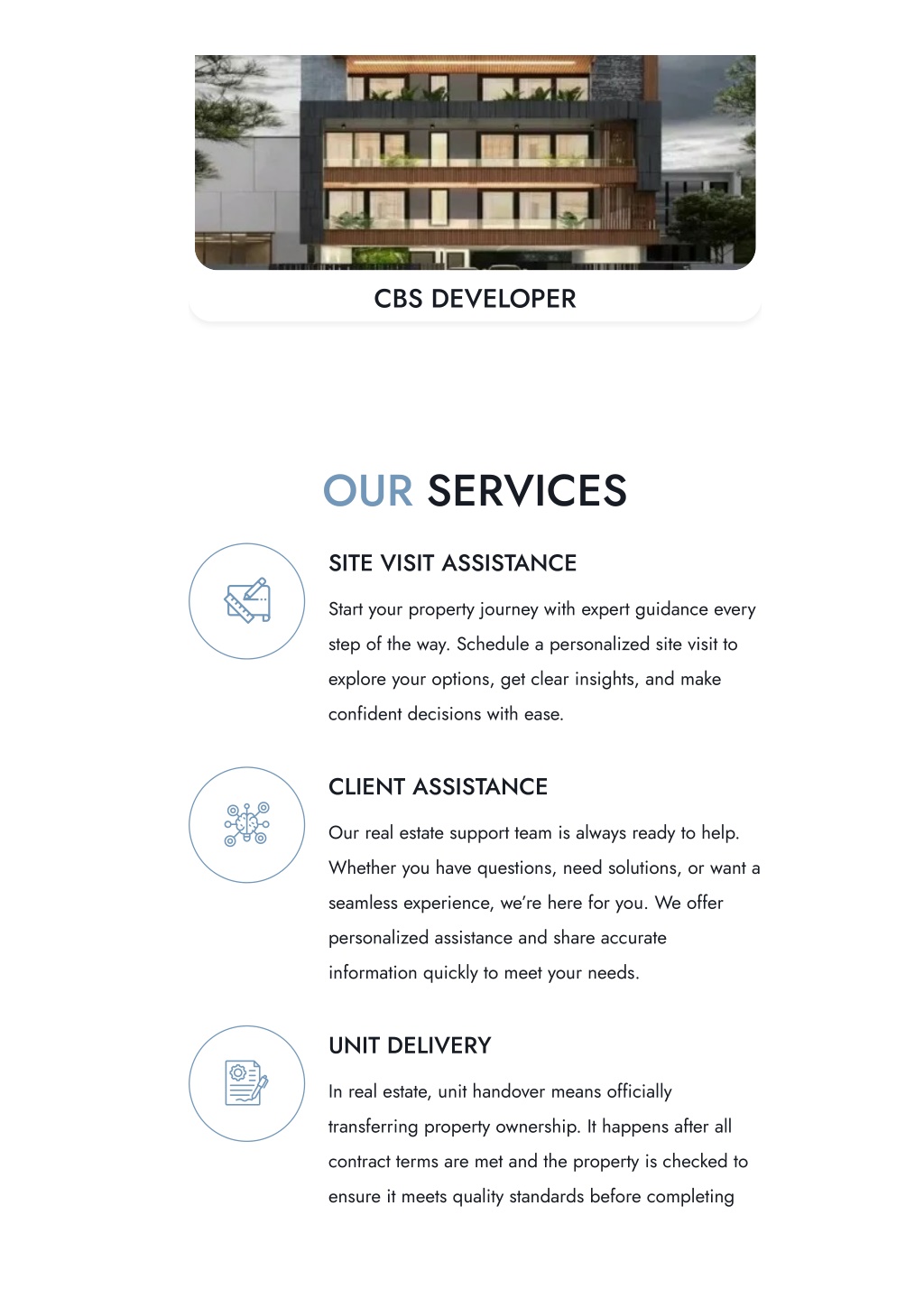 CBS DEVELOPER OUR SERVICES SITE VISIT ASSISTANCE Start your property journey with expert guidance every step of the way. Schedule a personalized site visit to explore your options, get clear insights, and make confident decisions with ease. CLIENT ASSISTANCE Our real estate support team is always ready to help. Whether you have questions, need solutions, or want a seamless experience, we’re here for you. We offer personalized assistance and share accurate information quickly to meet your needs. UNIT DELIVERY In real estate, unit handover means officially transferring property ownership. It happens after all contract terms are met and the property is checked to ensure it meets quality standards before completing