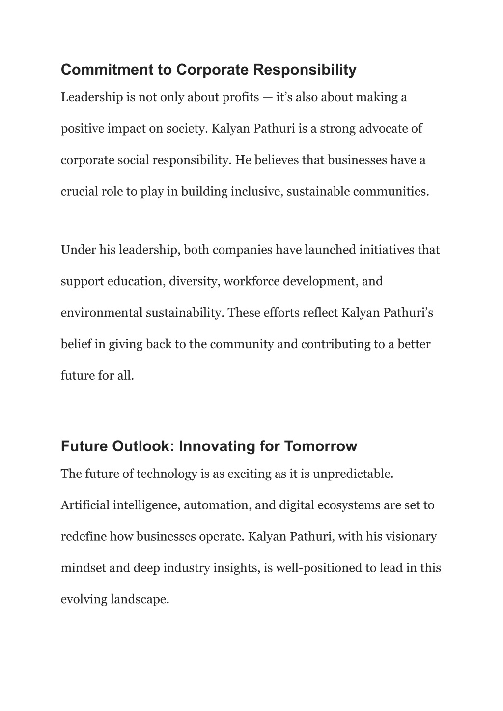 Commitment to Corporate Responsibility Leadership is not only about profits — it’s also about making a positive impact on society. Kalyan Pathuri is a strong advocate of corporate social responsibility. He believes that businesses have a crucial role to play in building inclusive, sustainable communities. Under his leadership, both companies have launched initiatives that support education, diversity, workforce development, and environmental sustainability. These efforts reflect Kalyan Pathuri’s belief in giving back to the community and contributing to a better future for all. Future Outlook: Innovating for Tomorrow The future of technology is as exciting as it is unpredictable. Artificial intelligence, automation, and digital ecosystems are set to redefine how businesses operate. Kalyan Pathuri, with his visionary mindset and deep industry insights, is well-positioned to lead in this evolving landscape.