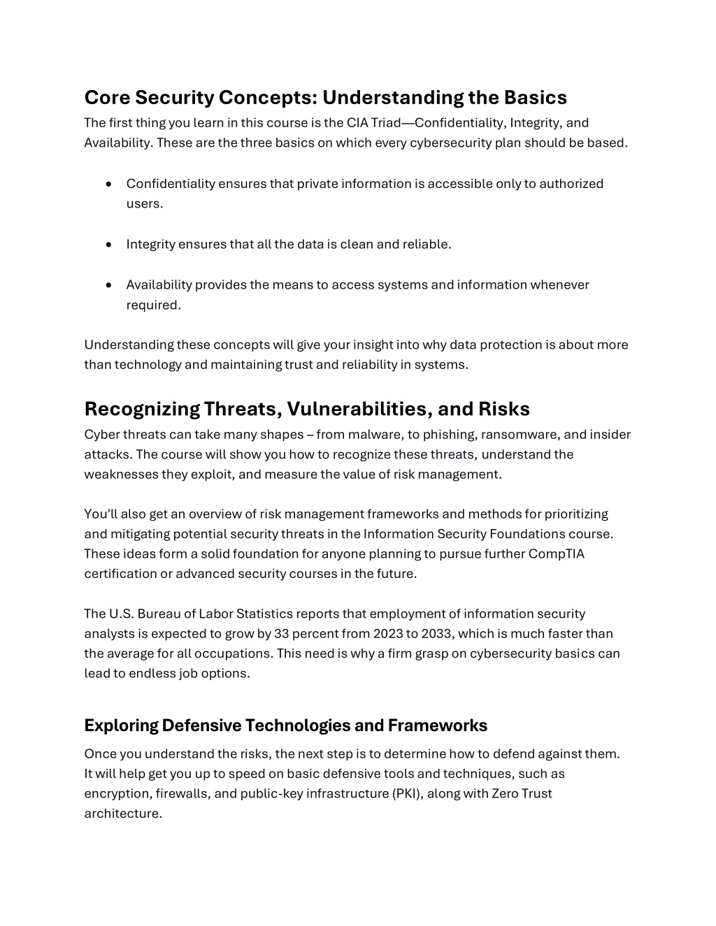 Core Security Concepts: Understanding the Basics The first thing you learn in this course is the CIA Triad—Confidentiality, Integrity, and Availability. These are the three basics on which every cybersecurity plan should be based. •Confidentiality ensures that private information is accessible only to authorized users. •Integrity ensures that all the data is clean and reliable. •Availability provides the means to access systems and information whenever required. Understanding these concepts will give your insight into why data protection is about more than technology and maintaining trust and reliability in systems. Recognizing Threats, Vulnerabilities, and Risks Cyber threats can take many shapes – from malware, to phishing, ransomware, and insider attacks. The course will show you how to recognize these threats, understand the weaknesses they exploit, and measure the value of risk management. You'll also get an overview of risk management frameworks and methods for prioritizing and mitigating potential security threats in the Information Security Foundations course. These ideas form a solid foundation for anyone planning to pursue further CompTIA certification or advanced security courses in the future. The U.S. Bureau of Labor Statistics reports that employment of information security analysts is expected to grow by 33 percent from 2023 to 2033, which is much faster than the average for all occupations. This need is why a firm grasp on cybersecurity basics can lead to endless job options. Exploring Defensive Technologies and Frameworks Once you understand the risks, the next step is to determine how to defend against them. It will help get you up to speed on basic defensive tools and techniques, such as encryption, firewalls, and public-key infrastructure (PKI), along with Zero Trust architecture.